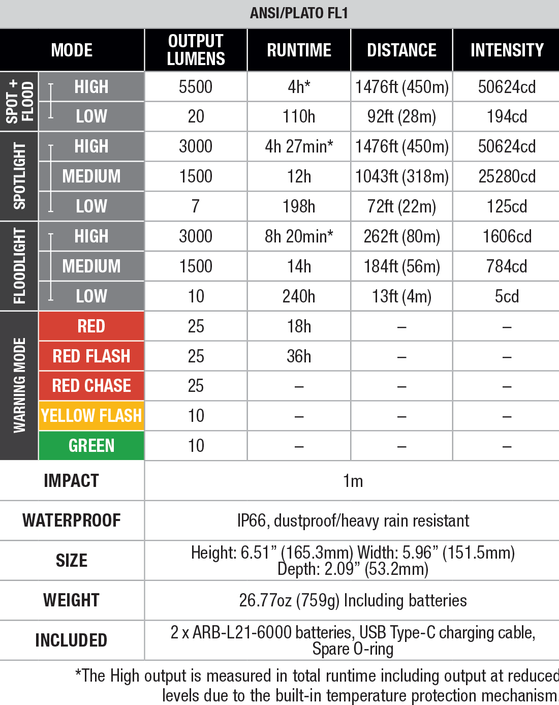 - Versatile Lighting: Spotlight, floodlight, or combined modes plus five warning lights including red flash, red chase, yellow flash, and green light.